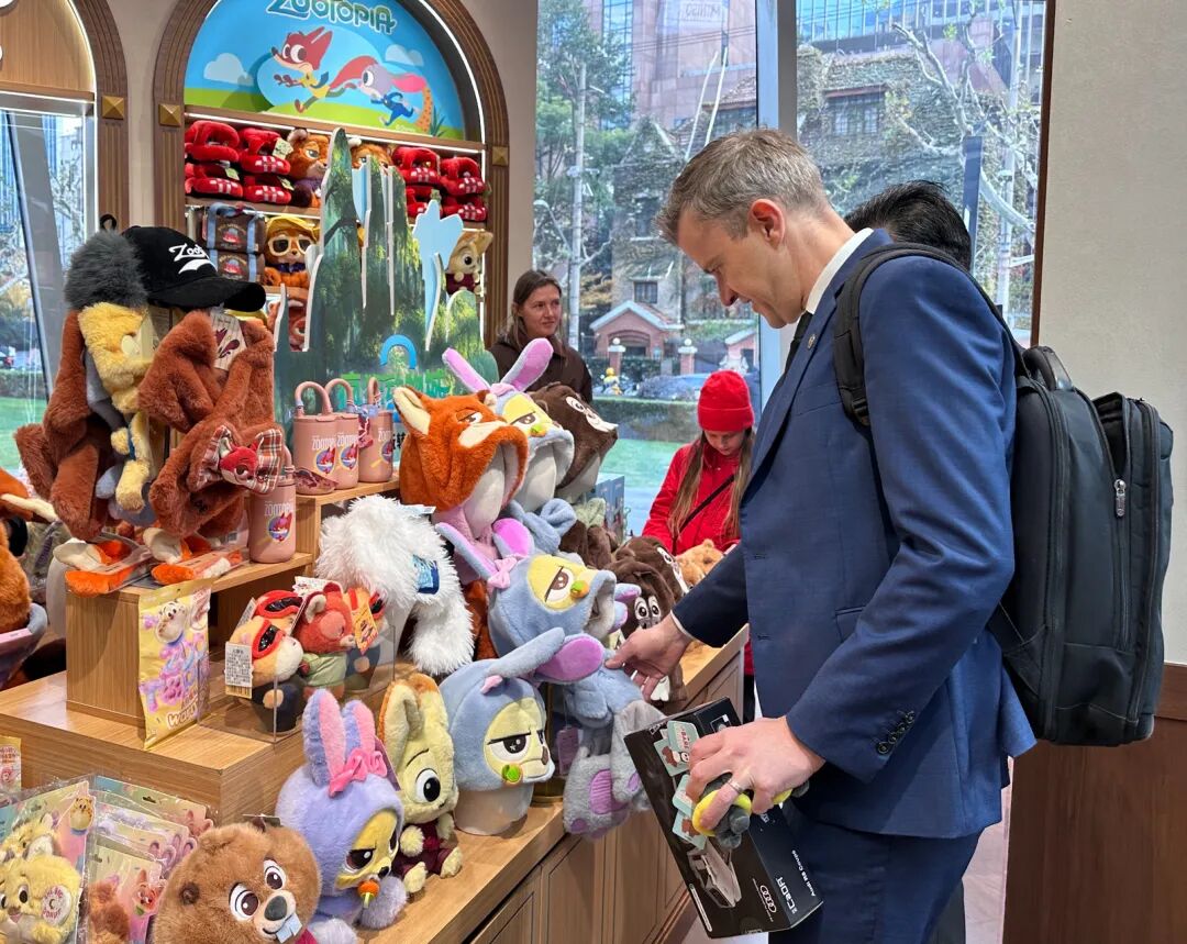 12月2日下午,记者来到位于上海静安的MINISO LAND,《疯狂动物城2》IP的帽子、公仔、玩偶、水杯等一系列商品吸引许多中外消费者选购。
